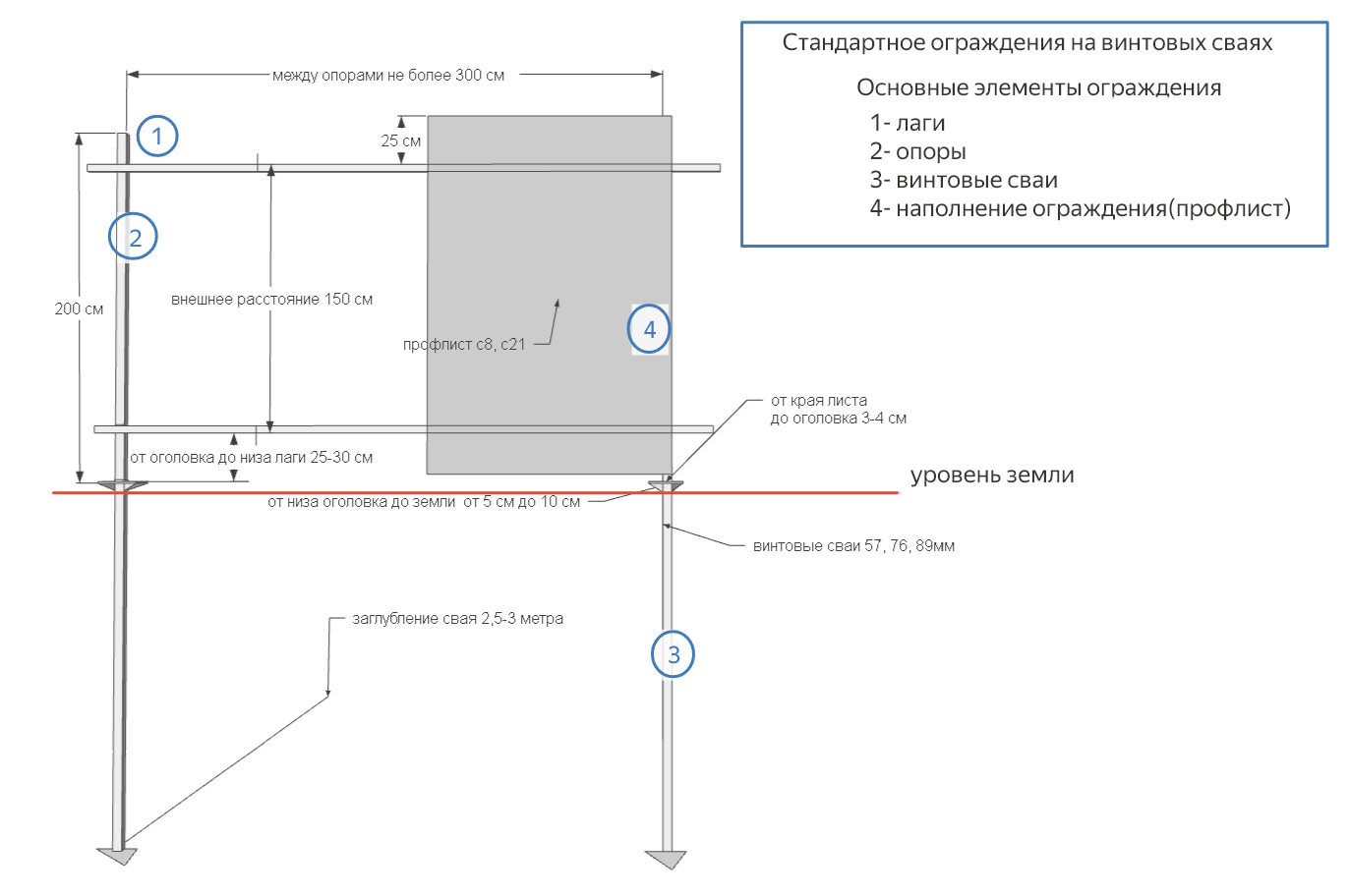 Ограждение из профилированного листа — недорогое и удобное решение, защищающее территорию от посторонних глаз, ветра и шума. Оно устойчиво к дождю и граду, легко ремонтируется, а также позволяет выбрать цвет и форму. Основные типы профилей — С8 и С21, толщина покрытия — от 0,35 до 0,5 мм. Долговечность конструкции обеспечивается винтовым свайным фундаментом, гарантирующим срок службы не менее 15 лет.